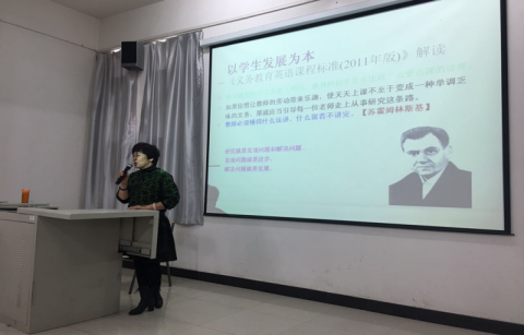 4月14日下午,外国语学院邀请包头市教育局教研员杜鹃为2014级学生解读中小学课程标准。讲座由严瑞清副院长主持,刘建芳、王俊萍等教学法老师参加。