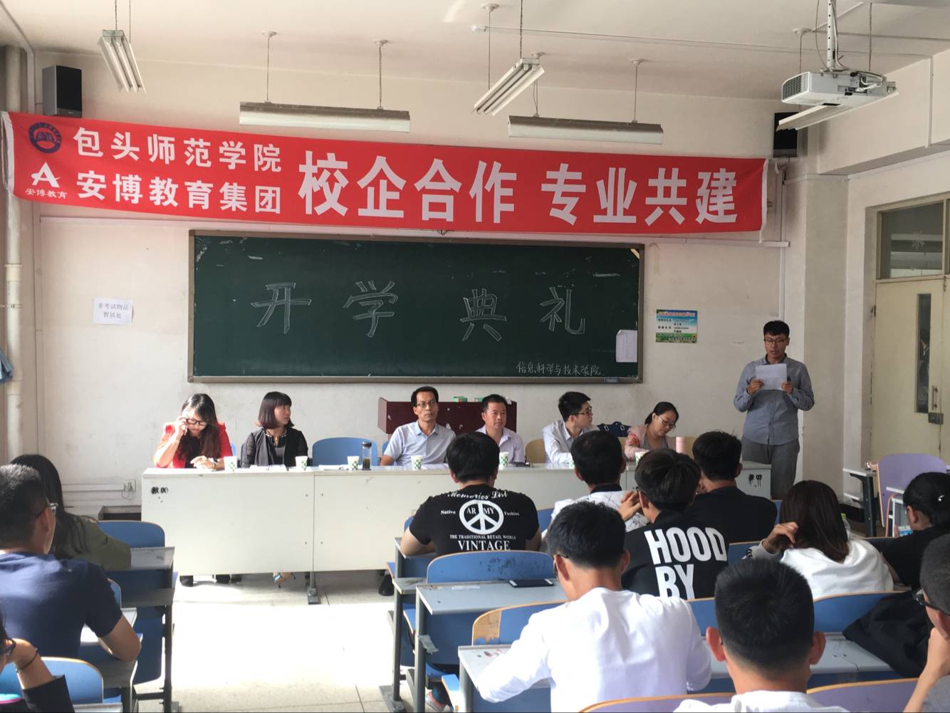 9月18日下午,信息学院和安博教育集团内蒙分公司在博学楼东201教室共同为2016级计算机服务外包专业新生举行开学典礼。安博内蒙分公司总经理赵静、教学总监林肯、总经理助理谢晓宇、教质经理靳婧、信息学院院长马占飞,副书记副院长郭宏升、计算机系部分教师、2016级外包班班主任及全体新生参加了开学典礼。