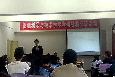 郭凯敏老师简要介绍了今年物理学院的考研情况,学长、学姐们分享了各自的考研经验。他们告诫准备考研的同学们,在学习中不仅要积累经验,掌握技巧,更要以平常心态看待考试,相信自己,并以他们自己的经历向大家说明了树立信心、不轻言放弃的道理。学长、学姐们用风趣,幽默的语言,既讲明了考研的重点,又提高了同学们的考研兴趣。