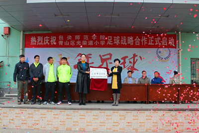 3月21日,体育学院与青山区光荣道小学就普及、推广校园足球文化活动等方面达成合作协议,并在光荣道小学举行了“包头师范学院足球教学实习培训基地”的揭牌仪式。体育学院李明升书记、车志宏院长,赵怀东副院长、足球教学部专职教师,光荣道小学张建华校长、包头市教育局体卫艺科马志超科长、青山教育局徐利斌局长、体卫艺科尚青松科长、足球办曲卫东主任等出席了本次启动仪式。