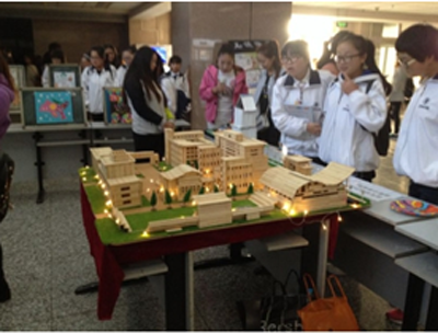 10月12日至14日,展出了学前教育专业学生创作的书法、绘画、剪纸、手工制作等优秀作品50件,其中2012级学前教育3班杨明远和部分同学设计制作的“包头师范学院南院建筑群模型”尤为引人注目,引来众多学生围观、拍照。该模型由一次性筷子胶粘拼接而成,作品灵感来源于变废为宝与中国传统手工艺作品传承的有机结合。