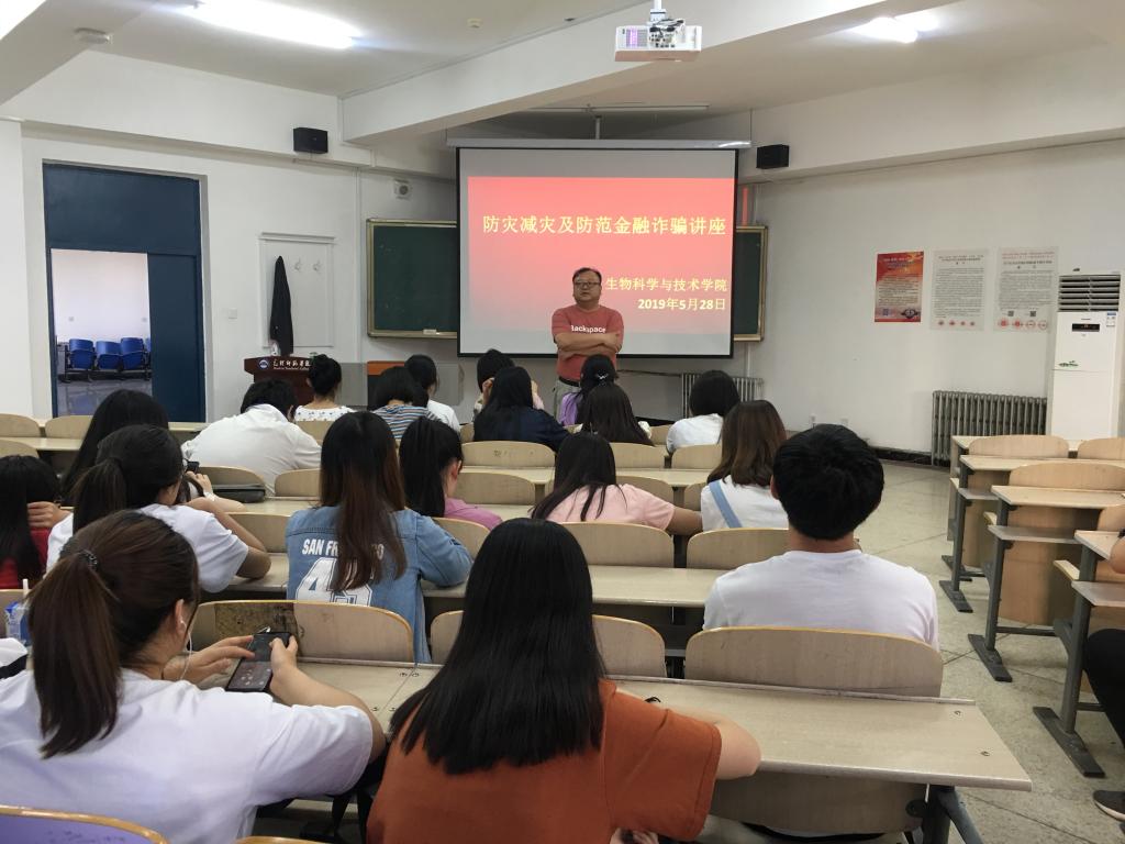 为提高在校大学生安全防范意识,加强学生对金融诈骗的认识,有效遏制金融诈骗事件的发生,5月28日晚,生物科学与技术学院特邀请保卫处张晓刚老师举办了“防灾减灾及防范金融诈骗”讲座。