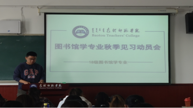 10月22日,历史文化学院在博西602召开图书馆学专业见习动员会。图书馆学系白禄老师、李健老师和2018级图书班全体同学参加本次会议。本次2018级图书馆学专业见习从2019年10月28日开始,共见习2周。主要见习单位有包头市三十六中、包头市四十五中、九原区图书馆、青山区图书馆、包头市图书馆、包头医学院图书馆、包头钢铁职业技术学院图书馆等。