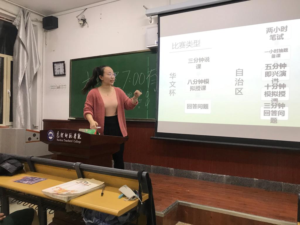王宁同学分享了教学设计和板书设计等内容,强调了教学设计和板书设计的重要性;刘佳同学分享了教姿教态和如何与学生互动的经验,使同学们更加了解了如何做一名优秀教师,更加重视在教学过程中的言行举止;安烨同学分享了说课和PPT的制作的经验,为同学们全方面讲解了教学事宜。在最后的提问环节,同学们提出自己在讲课方面的疑惑,三位同学一一解答,精彩的讲述让同学们受益匪浅。
