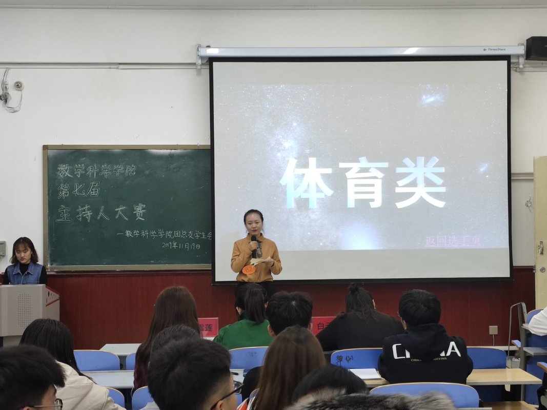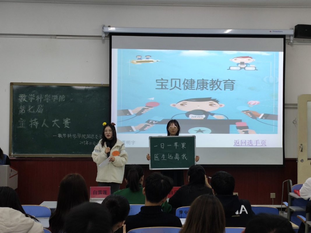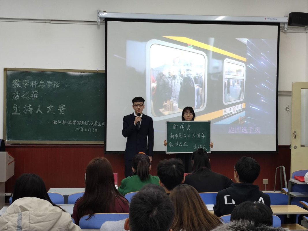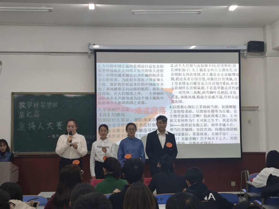 为丰富学生课余生活,提高学生口语表达能力,11月19日晚19:00,数学科学学院举办了第七届主持人大赛。大赛由数学科学学院文艺部、心理健康协会和益加翼教师技能协会共同举办。
