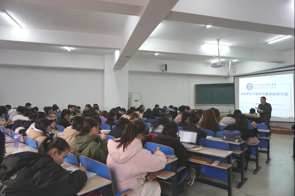 11月28日,历史文化学院召开全体学生干部学风建设动员大会。学院党总支副书记、副院长吴冰老师出席会议并作动员讲话,团总支书记、学工办主任孟令宏,辅导员张英老师参加会议,学院团总支、学生会、社团全体学生干部及各班干部、各宿舍长参加会议。会上,吴冰老师传达了学校《加强学风建设工作实施方案》文件精神,孟令宏老师宣读了《历史文化学院加强学风建设工作实施方案》,对学院加强学风建设工作进行了具体部署。(历史文化学院)