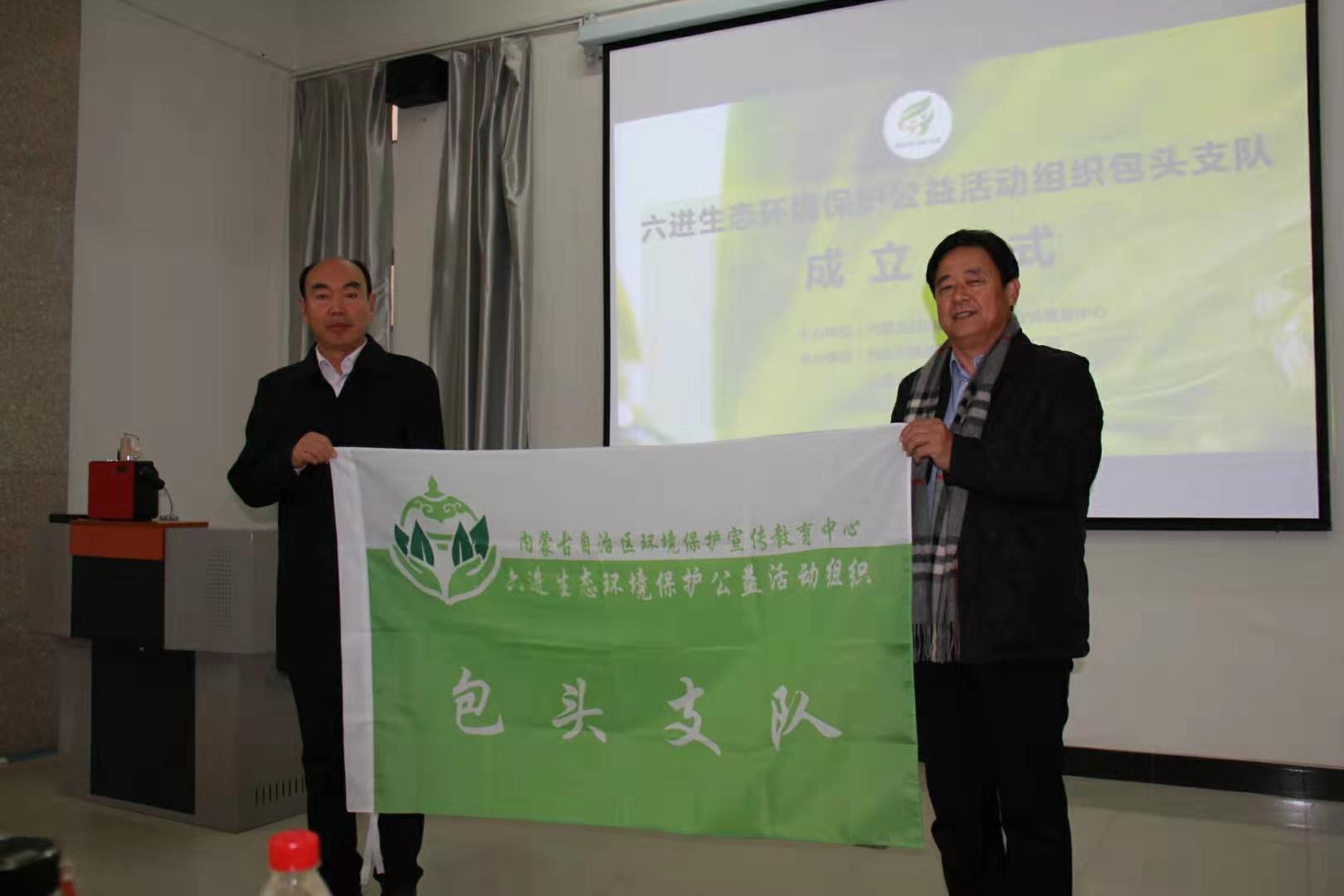 化学学院党总支书记史继敏表示,共筑北疆绿色生态安全屏障是每个人应尽的义务,全体师生应秉承环境为先的发展观,做无污染的化学人。在随后的授旗仪式中,韩玉超会长和魏兵院长为参加讲座的志愿者们颁发了绶带及证书,并由韩玉超会长向化学学院授予“六进生态环境保护公益活动组织包头支队”旗帜。