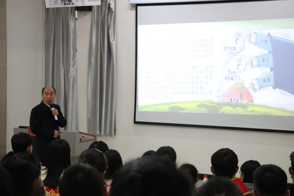 授旗仪式结束后,内蒙古环保科技行业协会副会长、环保公益宣教团组委会主任、我校化学学院院长魏兵为参会师生进行了以“打赢污染防治攻坚战”为主题的环保知识讲座,强调环保是每个人的责任,增强环保意识刻不容缓。他还为大家介绍了“低碳生活”和“无废城市”建设试点项目,包头市作为内蒙古自治区唯一一座城市位列“无废城市”名单。