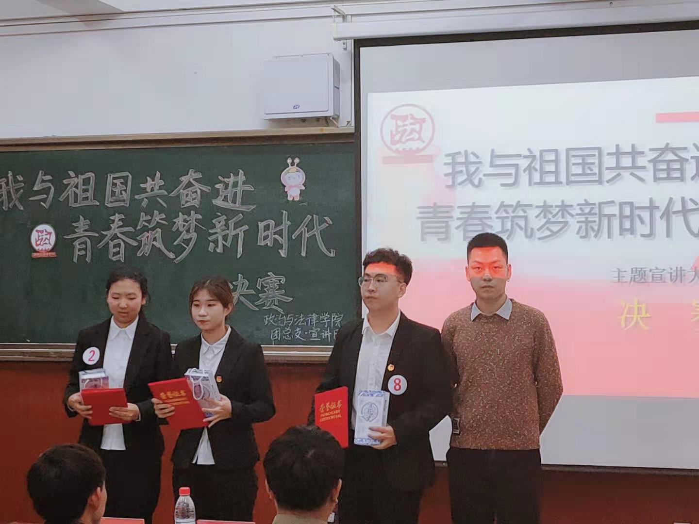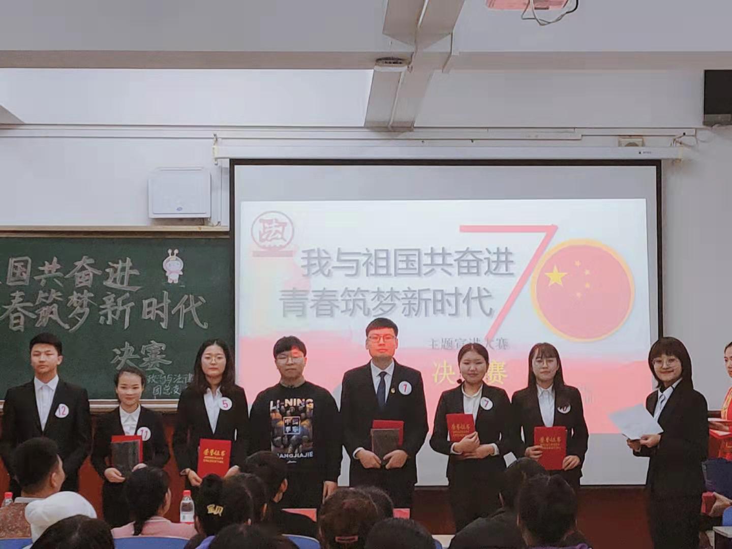 为了提高我校学生政治理论水平,推进我校思想政治教育工作的开展,让当代大学生肩负起新时代下的使命责任与担当,政治与法律学院在全校举办以“我与祖国共奋进,青春筑梦新时代”为主题的宣讲大赛。大赛从11月初开始,经过初赛、复赛,于12月4日在博500举行了决赛。