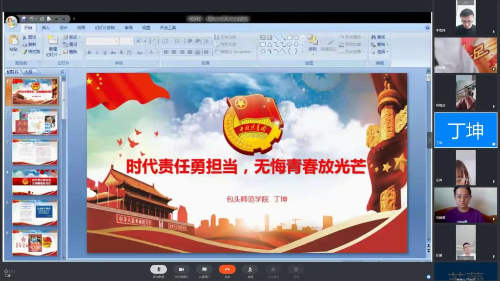 团课中,丁老师首先表达了对同学们的想念之情,嘱咐同学们依然不要放松疫情防护。丁老师围绕“时代责任勇担当,无悔青春放光芒”的主题,引经据典,结合实例,娓娓动听的讲述了90后、00后在此次疫情防控中做出的贡献,丁老师引用习近平总书记的:“生命重于泰山,疫情就是命令,防控就是责任。”突出体现了在此次疫情之中,青年医务工作者成为扛起大梁的主力军!
