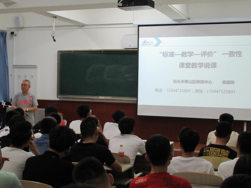 为了更好地提高体育学院学生的职业技能,强化师范生教学的基本功,同时也为了教育实习做好准备。9月8日下午,体育学院王晓澄副教授就《基于新课标下的中小学体育课堂教学设计与问题研究》为2017级的学生进行了讲解与分析。9月9日晚,青山区教育局体育调研员崔国栋老师及他的名师工作坊团队受邀为体育学院2017级学生就体育说课等相关内容进行阐述及演示。优秀体育教师王国强和王俊杰就《说课案例分析》、《基于标准的目标制定》等内容做了案例演示。