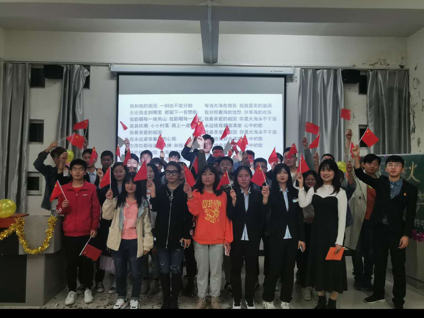 活动在主持人热情洋溢的致辞下拉开帷幕。主持人幽默和谐,同学们热情高昂,将歌曲演唱、舞蹈、观看爱国视频、深情朗诵、即兴游戏完美结合在一起,整场活动内容丰富,形式多样,整个会场轻松愉悦,喜庆热闹。最后,活动在整齐高昂的《我和我的祖国》大合唱中落下帷幕。