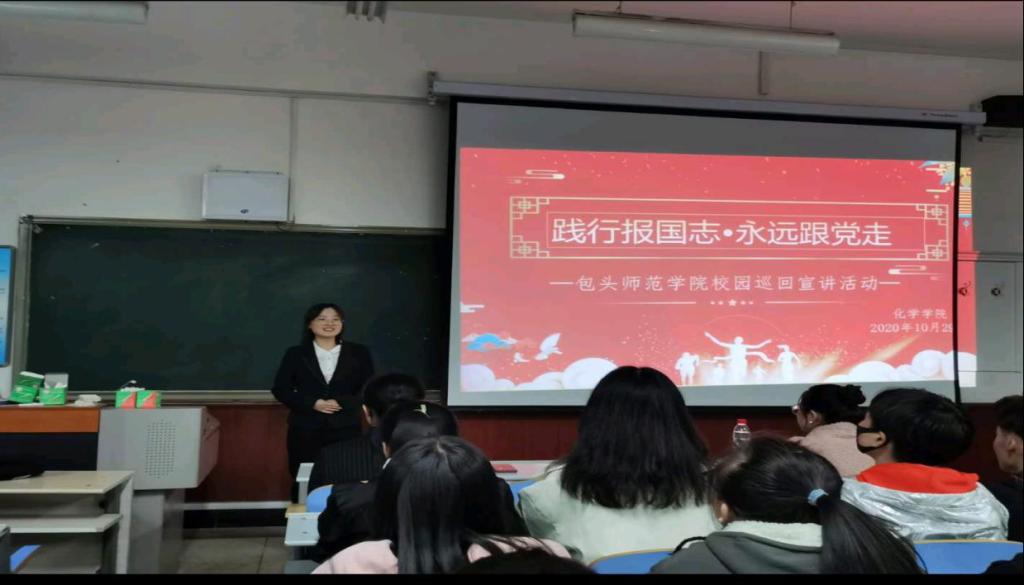 为提高广大学生的政治理论素养,响应大学生形势政策教育巡回宣讲精神,化学学院于2020年10月29日19:30在博东206举办以“践行报国志•永远跟党走”为主题的宣讲活动。化学学院2019级和2020级的部分同学参加了此次活动。